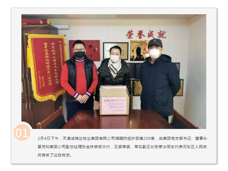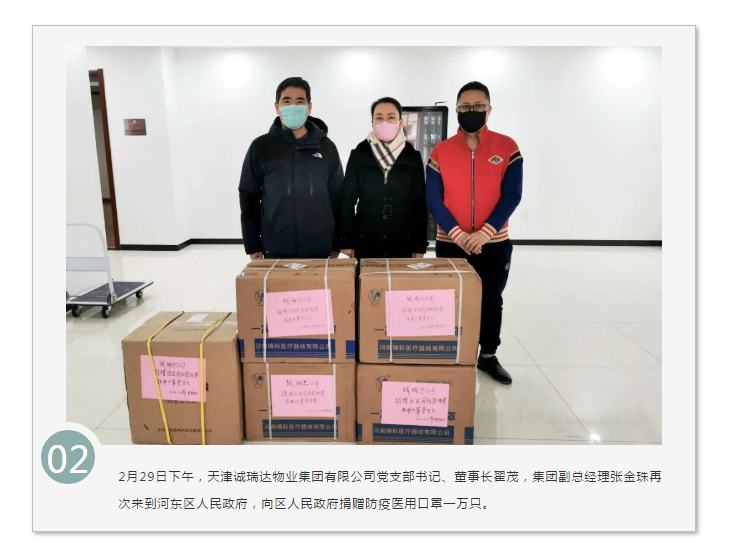 在全國人民抗擊新型冠狀病毒感染肺炎疫情的關(guān)鍵時刻,天津誠瑞達集團繼2月4日,向河?xùn)|區(qū)人民政府捐贈護目鏡200套后,為助力天津市早日取得防疫阻擊戰(zhàn)的全面勝利,2月29日,再次向河?xùn)|區(qū)人民政府捐贈醫(yī)用口罩一萬只,為河?xùn)|區(qū)抗擊疫情貢獻星火之力。